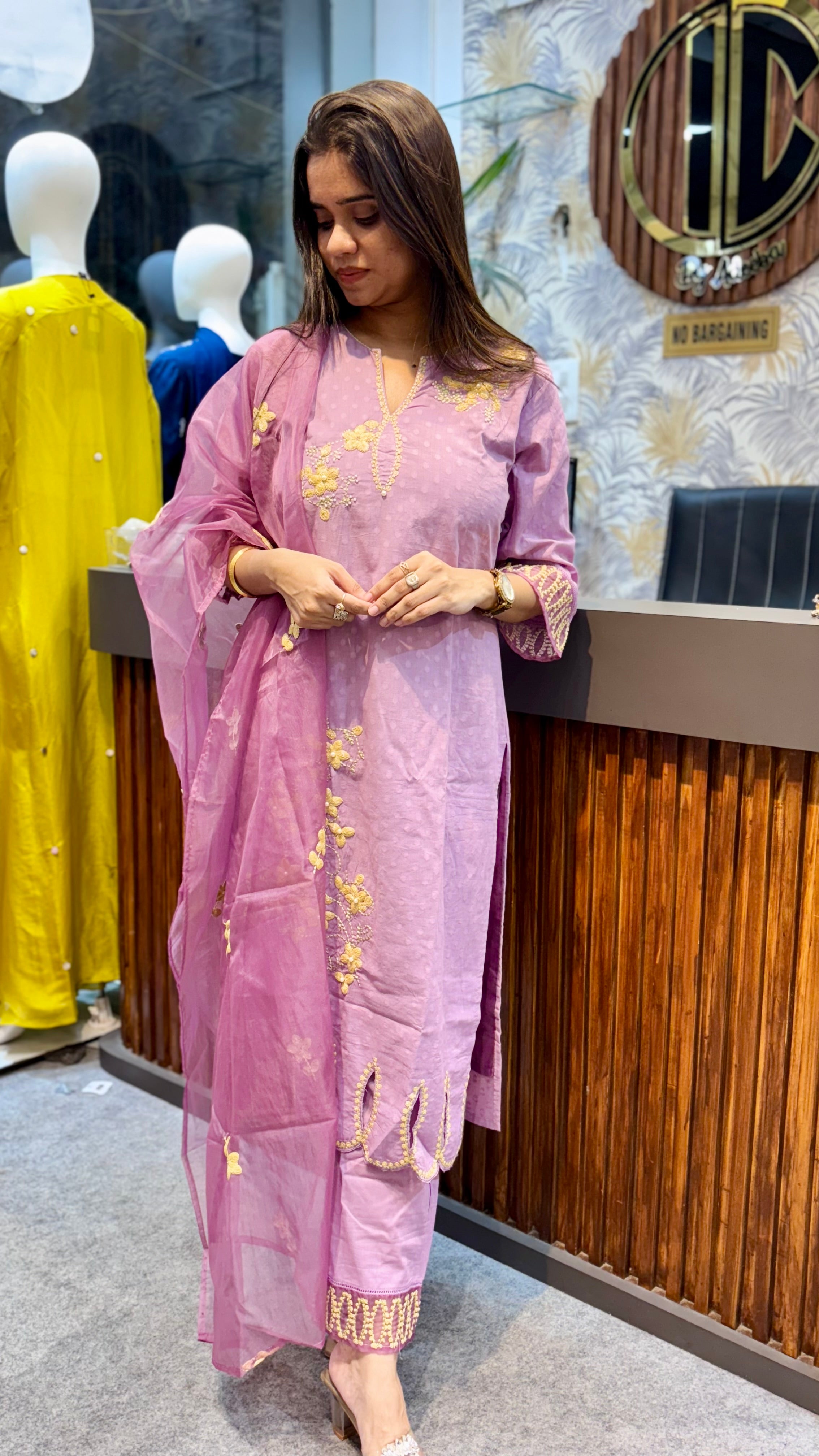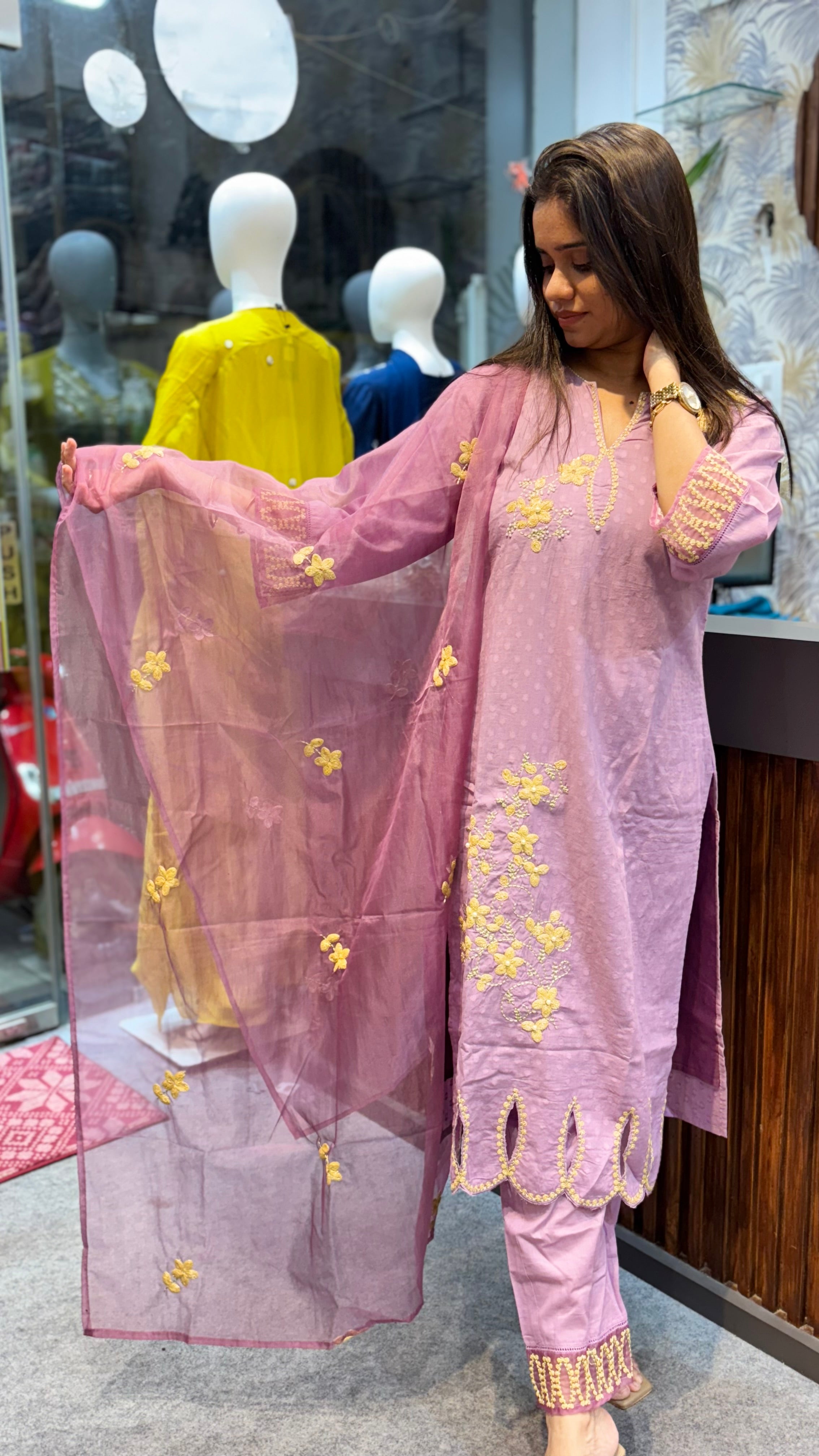 Comes on cotton fabric with all over thread embroidery and cutwork done, paired up with organza dupatta and straight pant to complete the look.