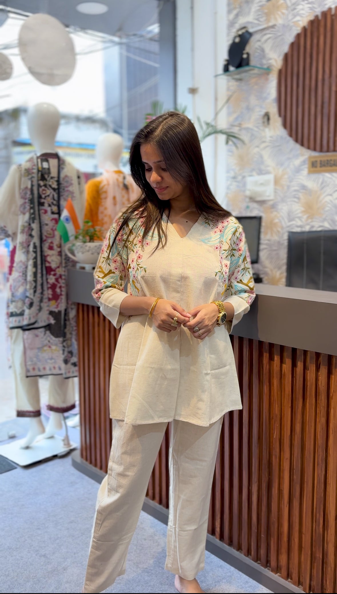 Comes on comfy linen fabric with intricate handwork on sleeves and shoulder, paired up with straight pant.
