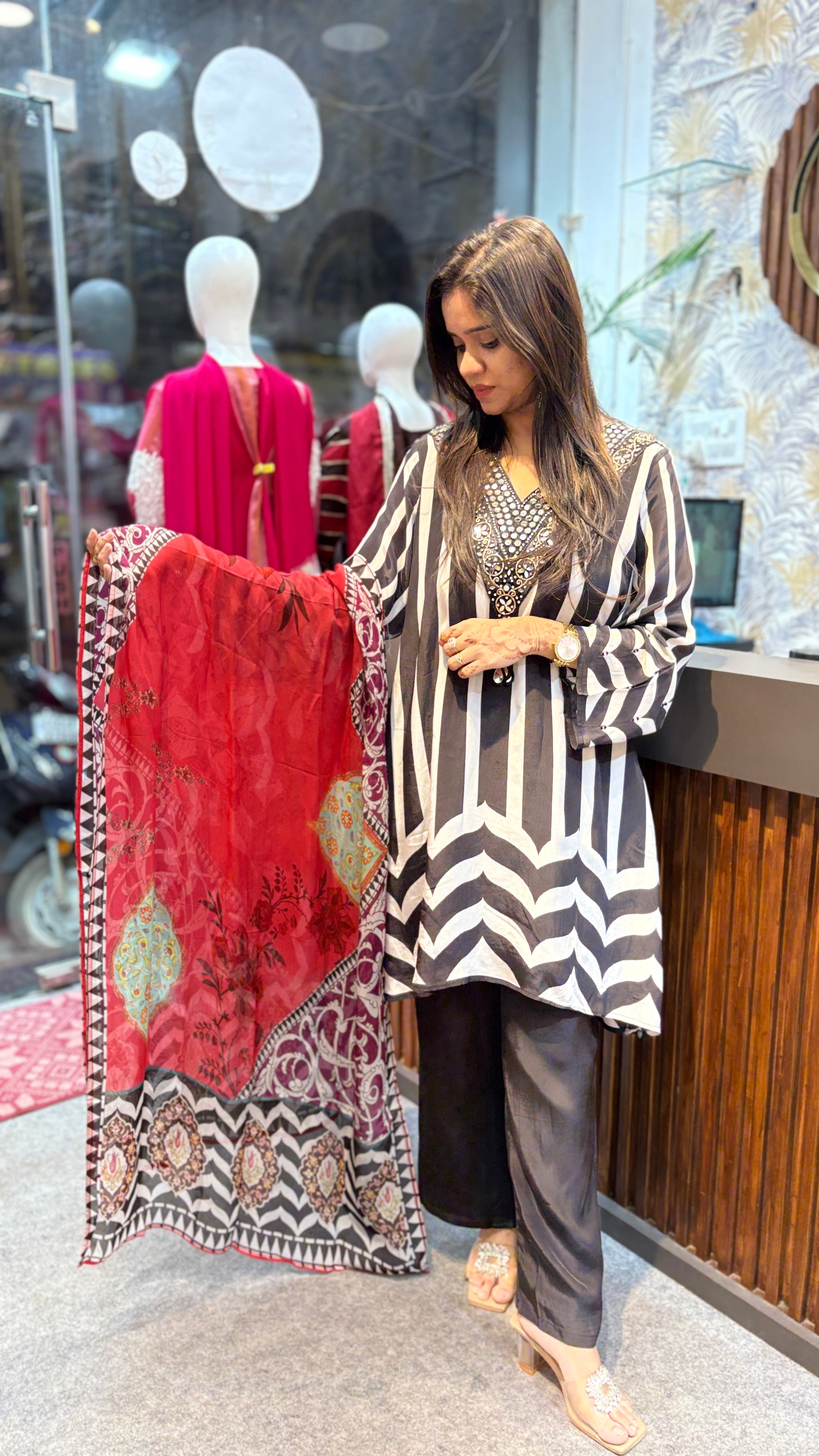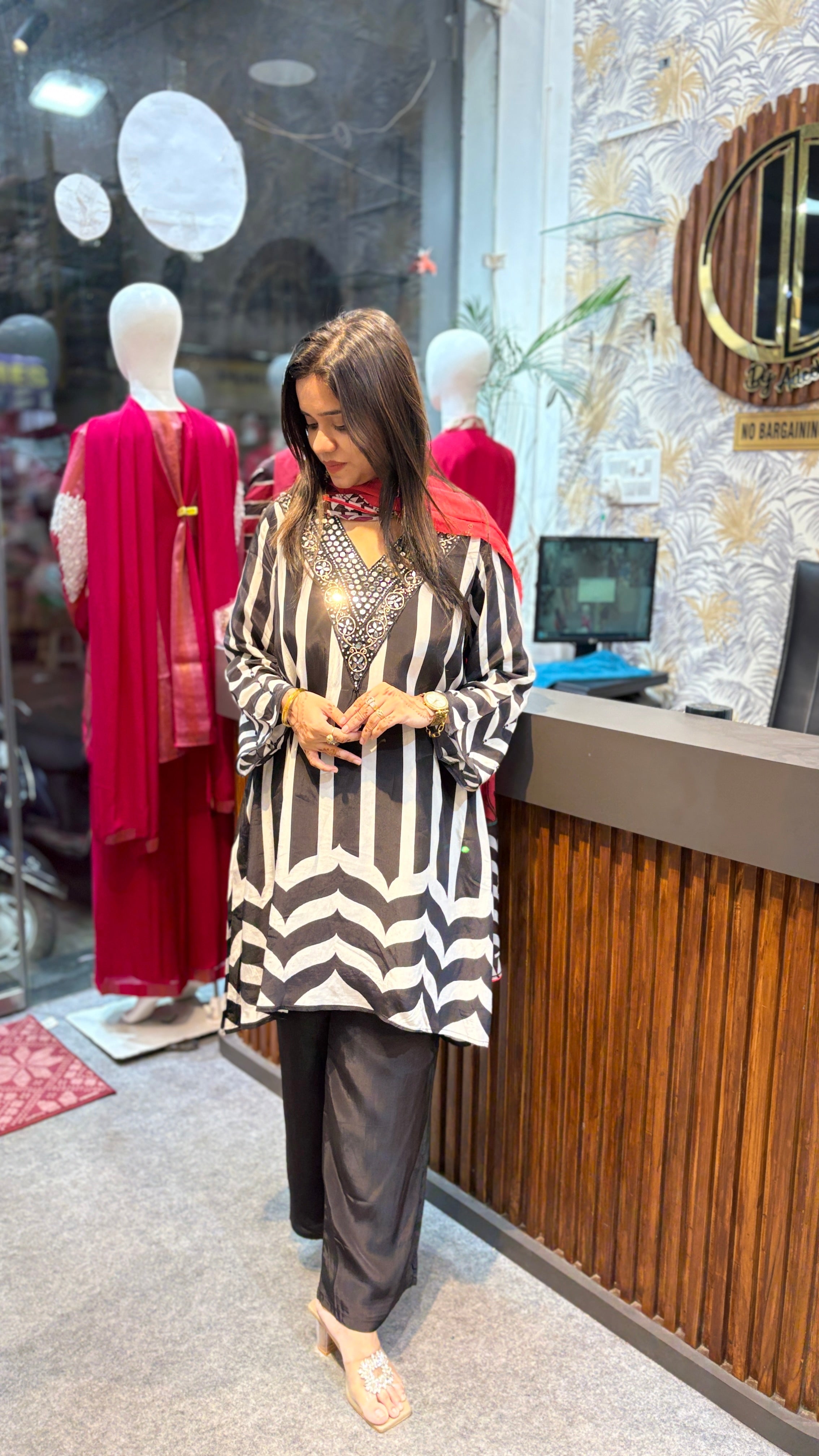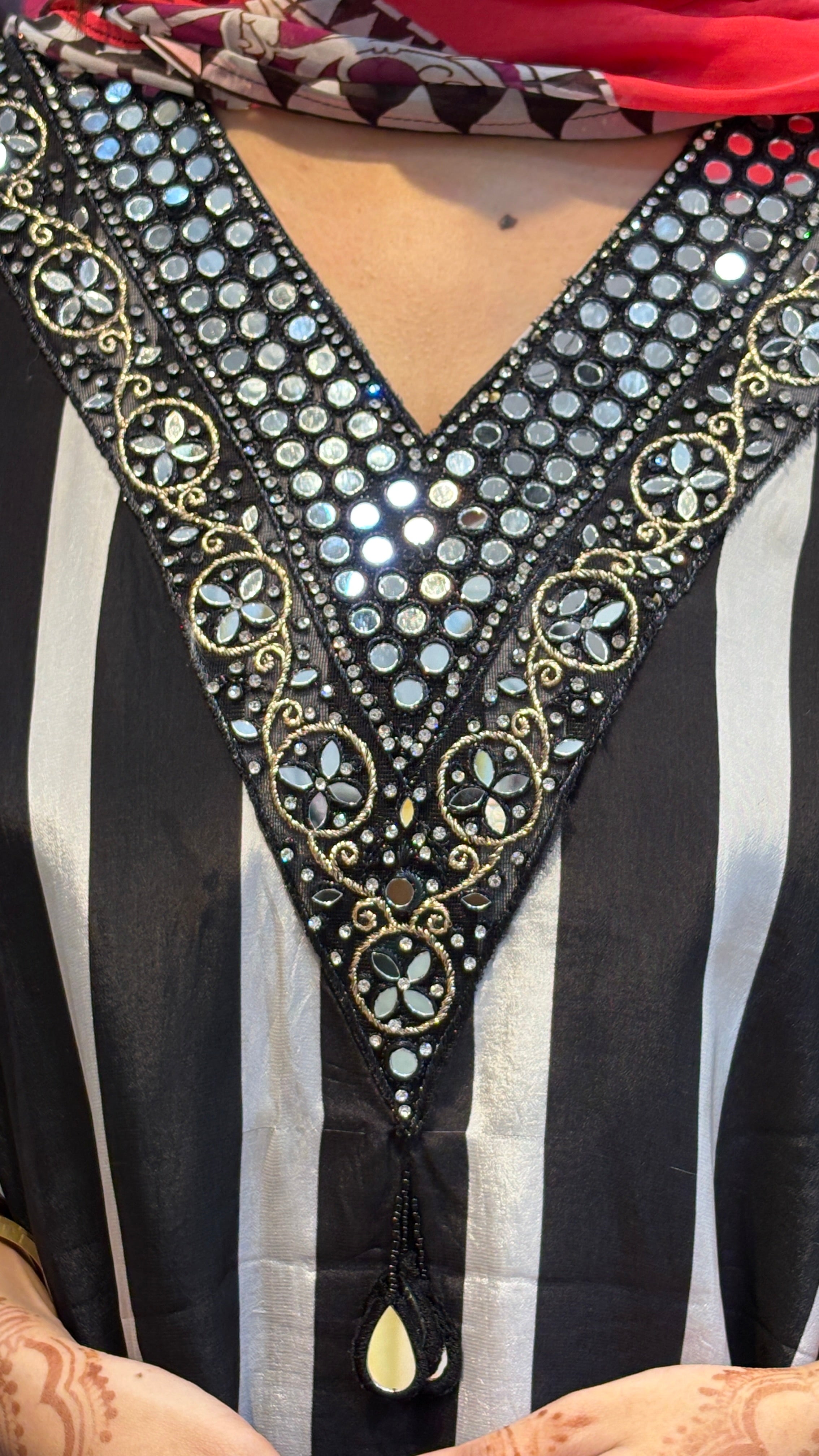 Comes on pure crepe fabric with lining attached and heavy mirror work on neck and sleeves with printed dupatta