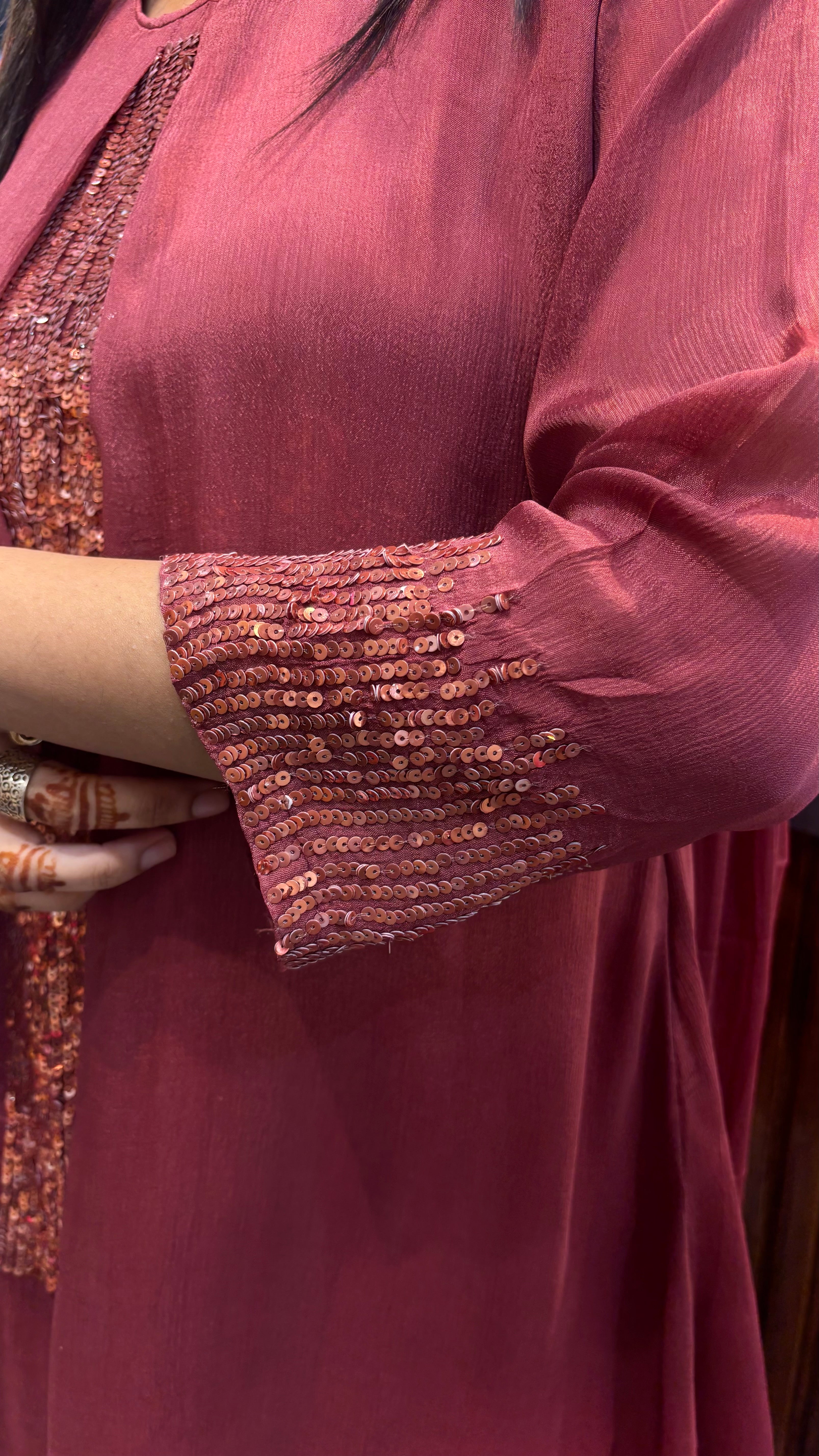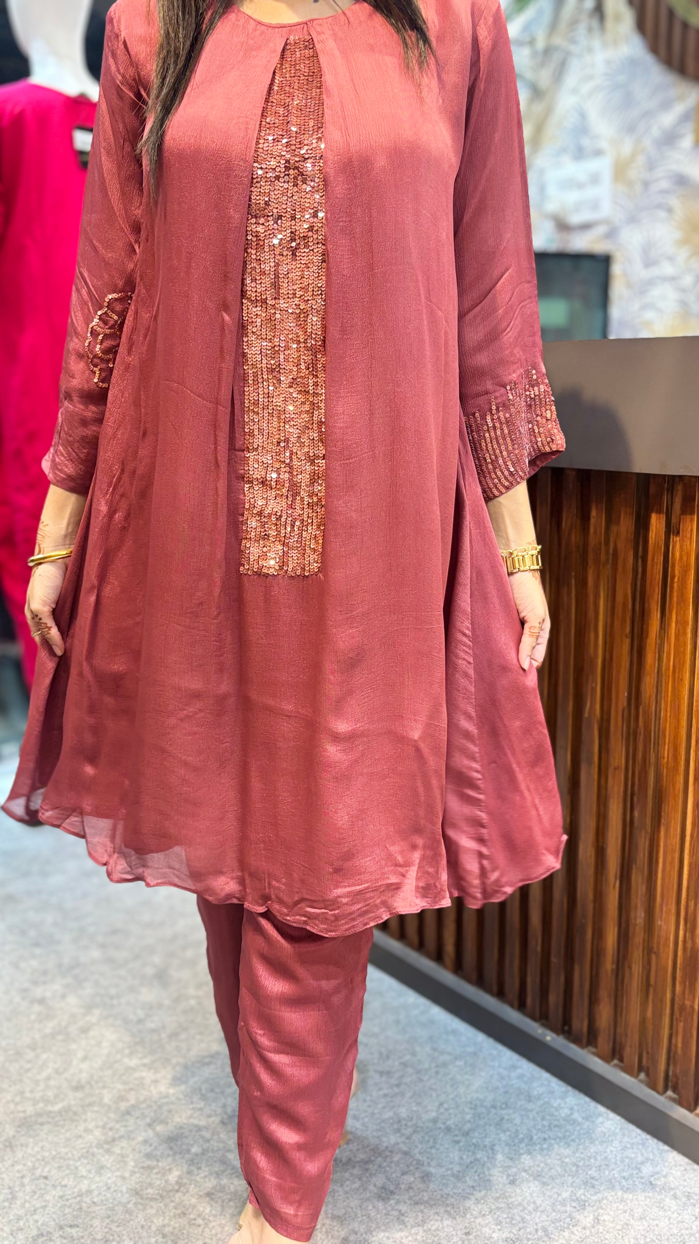 Comes on pure crepe fabric with stylish kurti combined with sequence panel work paired up with straight pant and chiffon dupatta