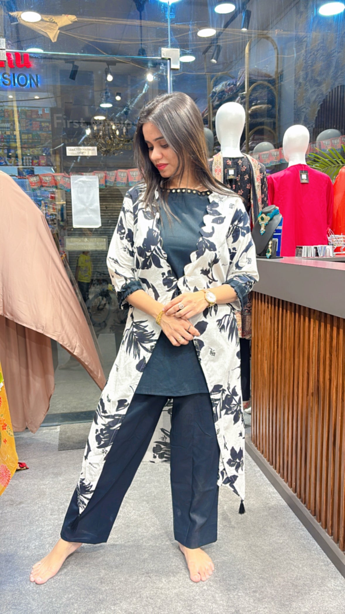 comes on cotton fabric with sleeveless inner, pant and printed jacket.