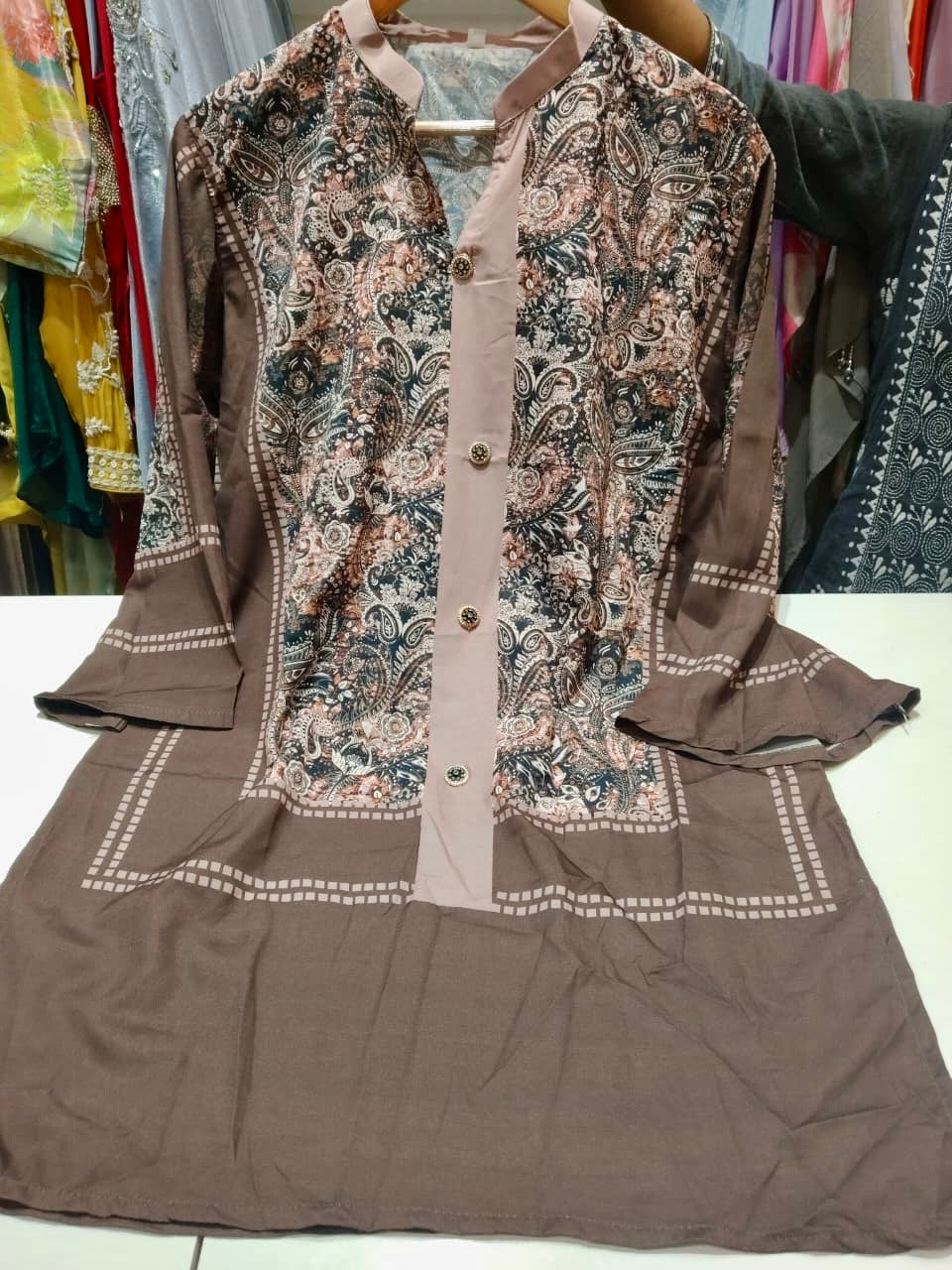 Comes on raw silk fabric with both kurti and pant printed front and back.